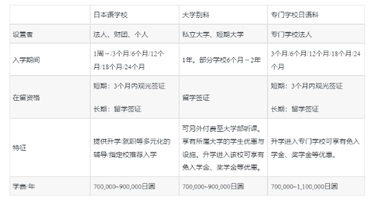 语言学校分成「日本语学校」、「大学别科」、「专门学校日语科」三种类别,它们的比较如下: