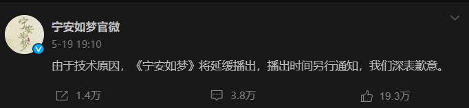 宁安如梦在今年5月初的时候,官方做过一波宣传,但随机在官微上面发微“由于技术原因,《宁安如梦》将延缓播出,播出时间另行通知,我们深表歉意。”