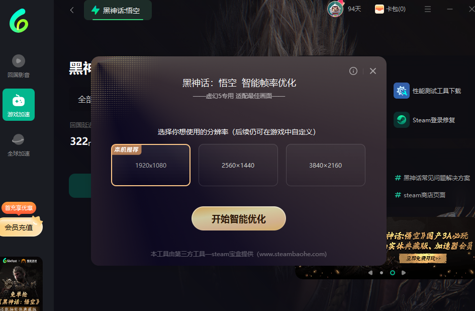 首先推荐一键设置的办法,玩家们可以下载sixfast,游戏库搜索黑神话悟空右边有实用小工具,点击匹配自己显示器的分辨率后就可以一键设置游戏设置,进游戏后我们就可以发现游戏帧率明显变化游玩变流畅