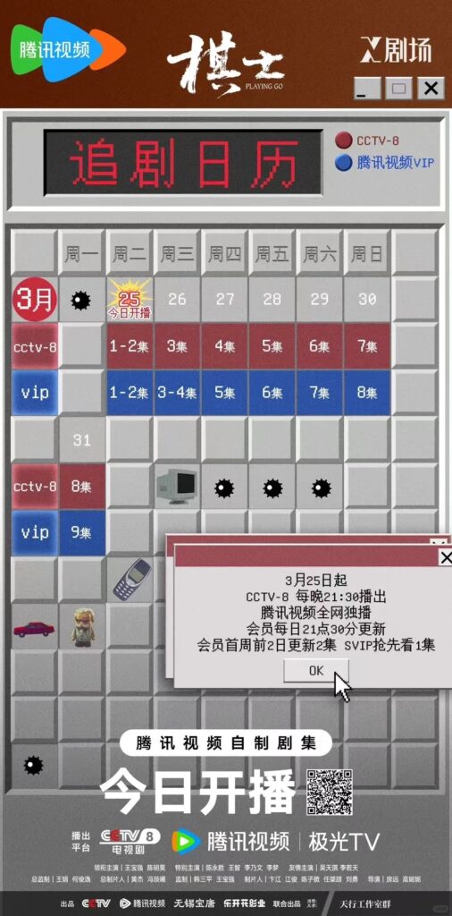 由腾讯视频、无锡宝唐和乐开花影业出品,房远、高妮妮联合执导,王宝强、陈明昊领衔主演的犯罪悬疑剧《棋士》于 2025 年 3 月 25 日在 CCTV-8 和腾讯视频 X 剧场同步首播。该剧以 21 世纪初南方城市为背景,讲述围棋老师崔业(王宝强饰)因卷入信用社抢劫案被迫协助劫匪逃脱,却意外发现围棋思维在犯罪领域的 “用武之地”,逐渐从普通人蜕变为高智商犯罪策划者,与身为警察的哥哥崔伟(陈明昊饰)展开黑白对峙的故事。