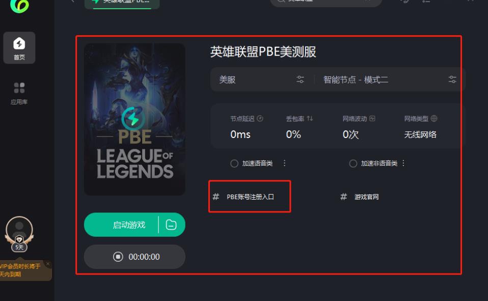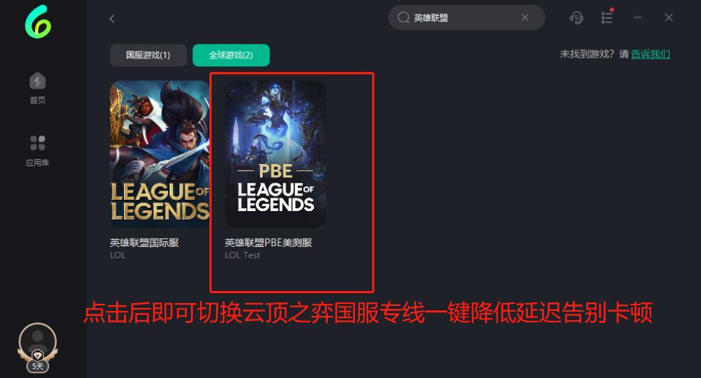 (6)接下来,选择【英雄联盟PBE美测服】游戏,如图所示,点击一键加速开启对云顶之弈的专线加速。