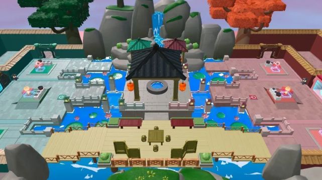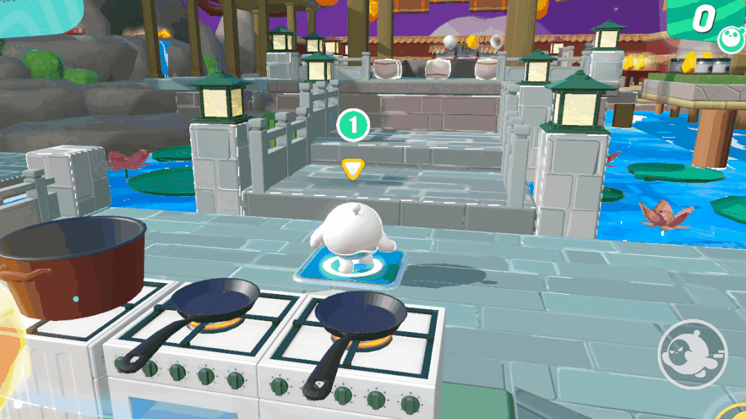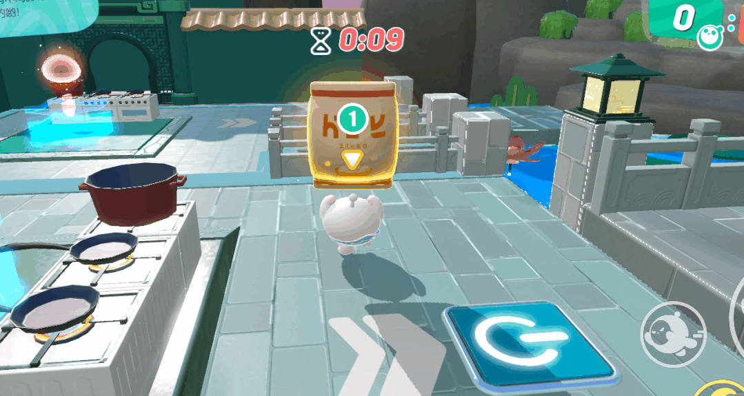 菠萝、芝麻、鲜肉和面粉,各种制作材料分布在中场区域;假山上、茶桌旁还有湖心亭中数量管够,满足蛋仔们的制作需要。