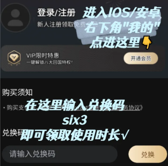 说明这个时候需要sixfast作为网络工具,它不仅全面支持国内应用,玩端游(永劫无间国服、英雄联盟国服)手游(王者荣耀、原神、幻塔)等都能用,现在打开客户端,按图示输入兑换码six3即可领取使用时长。
