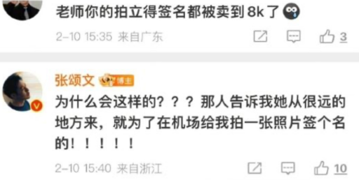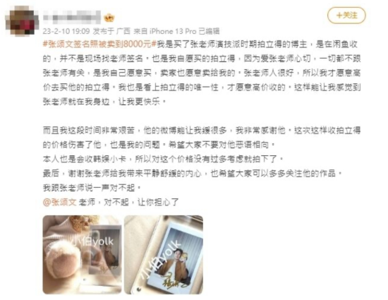 结果钓出购买签名照的粉丝回应:「我是买了张老师演技派时期拍立得的博主,是在闲鱼收的,并不是现场找老师签名。也是我自愿买的拍立得。」「这次这样收拍立得的价格伤害了他,也是我的问题。希望大家不要对他恶语相向。」「最后,谢谢张老师给我带来平静舒缓的内心,也希望大家可以多多关注他的作品。我跟张老师说一声对不起。」张颂文也对此表示「谢谢你,已经很感谢大家的厚爱了,千万不要去花冤枉钱。」