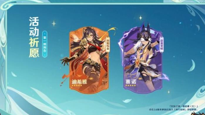 在3.5版本第一期角色活动祈愿中,游戏内将同时开放角色活动祈愿-1「烈阳烁金」与角色活动祈愿-2「雳裁冥昭」。全新五星角色「炽鬃之狮·迪希雅(火)」将出现在角色活动祈愿中「烈阳烁金」中,「缄秘的裁遣·赛诺(雷)」则在角色活动祈愿-2「雳裁冥昭」中迎来返场。「炽鬃之狮·迪希雅(火)」将会在3.6版本更新后加入「奔行世间」常驻祈愿。
