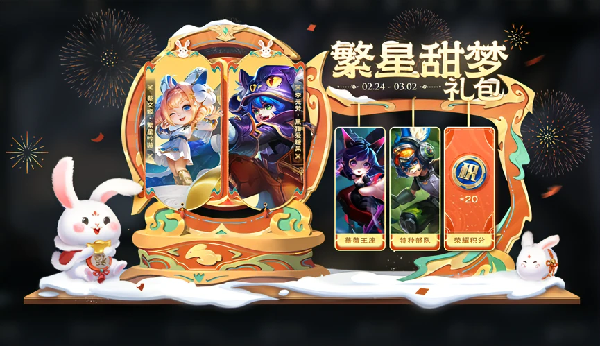 繁星吟游、黑猫爱糖果、蔷薇王座、特种部队、皮肤碎片*2、荣米积分*20、新品皮肤抽奖券*1、钻石*20。累计100次必得繁星吟游和黑猫爱糖果。