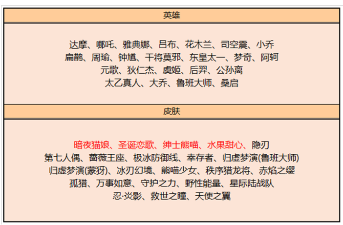 甄姬-冰雪圆舞曲、蔡文姬-舞动绿茵、嬴政-暗夜贵公子、刘禅-绅士熊喵、孙尚香-水果甜心、李白-千年之狐、刘邦-德古拉伯爵、后羿-阿尔法小队