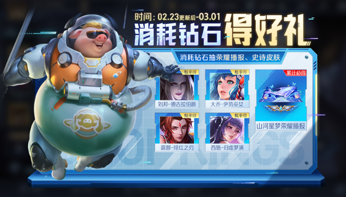 钻石消耗活动将在2月23日开启,消耗钻石可兑换必得2个皮肤碎片和山河星梦荣耀播报,有极小概率获得永久史诗皮肤或伴生皮肤。