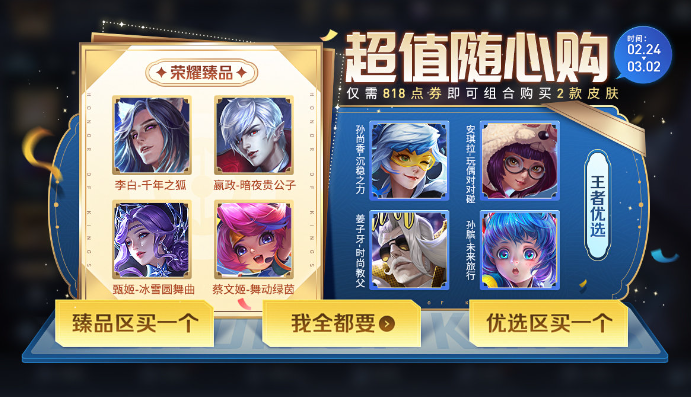 玩家可在荣耀臻品&王者优选分别选择一款商品,打包购买,该活动仅可参与一次。