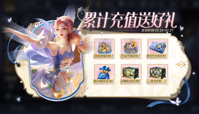 累计充值活动将在2月24日开启,第五个档位送回城特效:金鼠送福或牛运亨通。