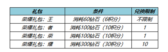 荣耀礼包:王:打开后必得铭文碎片*20,有一定几率额外获得精选皮肤自选宝箱*1(打开后可选择以下奖励之一:刘邦-德古拉伯爵、大乔-伊势巫女、西施-归虚梦演、露娜-绯红之刃、皮肤碎片*6)获得皮肤宝箱概率为0.01%,全服限量40万份