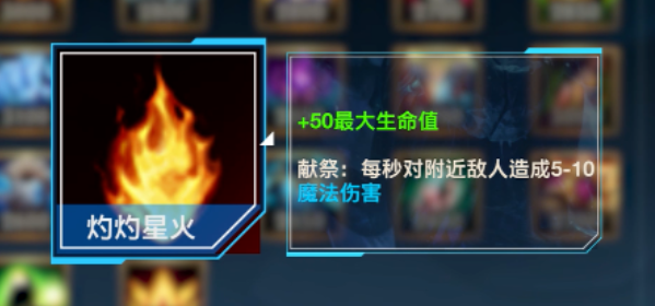 灼灼星火:增加最大生命值上限,被动效果为每秒对周围敌人造成小额伤害。