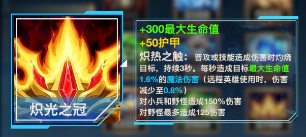 炽光之冠:提供最大生命值上限、护甲加成,普攻和技能对敌人造成伤害时,能持续对敌方造成基于目标最大生命值百分比的伤害。