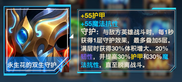 提供护甲、魔抗加成,在与敌方英雄作战时,能逐渐获得守护效果,累加至满层后,获得体积增大、韧性效果,并使护甲和魔抗得到显著提升,直至脱离战斗。