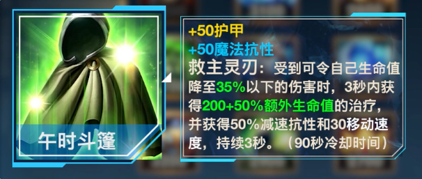 午时斗篷:提供护甲、魔抗加成,当召唤师的生命值低于一定值时,可在数秒内获得基于额外生命值的治疗效果,同时提供减速抗性和移速加成效果。