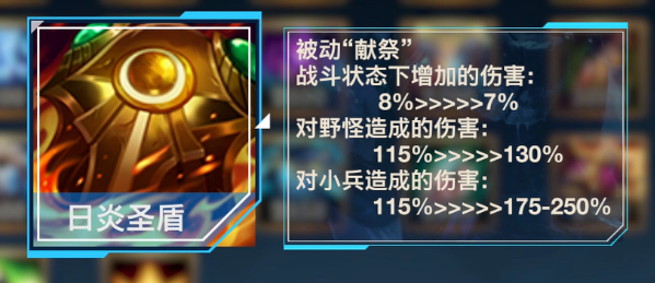日炎圣盾:略微降低被动效果在战斗中增加的伤害,但伤害量对小兵和野怪大幅提升。