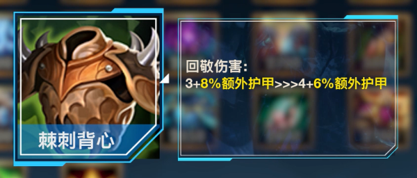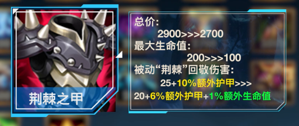 荆棘之甲:装备总价降低,最大生命值加成降低,被动效果的基础伤害提高、额外护甲加成降低、新增额外生命值伤害加成