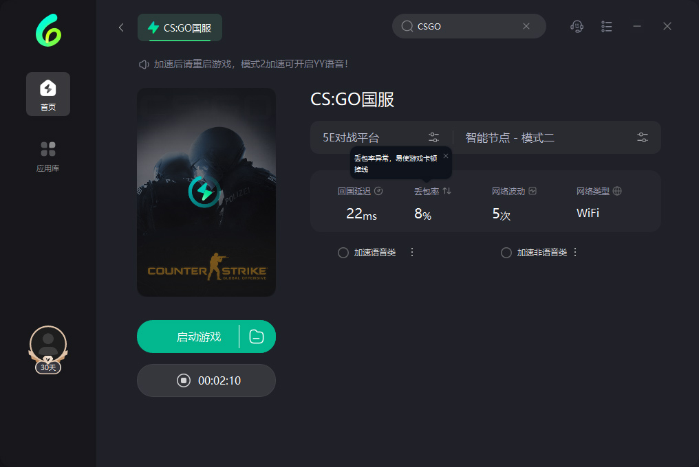 由于海外玩国服csgo需要构建国内网络环境,在Sixfast中搜索找到csgo国服,开始加速就可以和国内朋友一起玩了,Sixfast专门做了csgo游戏精细化优化,加速后大幅度降级延迟,同时还能快速启动游戏哦。这里没有加速时长的玩家在Sixfast 【我的】内找到【卡券兑换】填【six4】或者在Sixfast官网,个人中心兑,兑换码处填【six4】就能领取免费时长了哦!