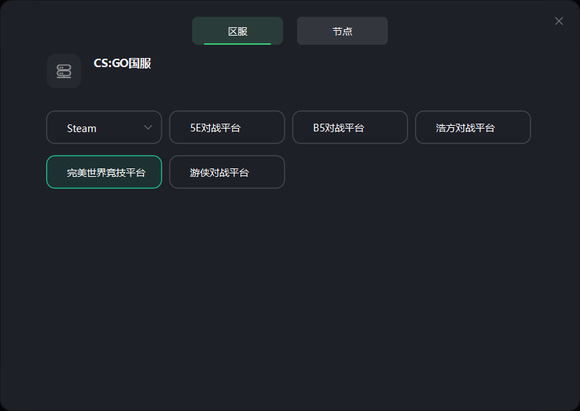 以CSGO为例,众所周知CSGO不仅需要网络稳定,也是需要语音交流的,启动Sixfast后搜索CSGO,即可进入选区界面,选择自己要加.速的区服,可以看到平台支持还是很全面的: