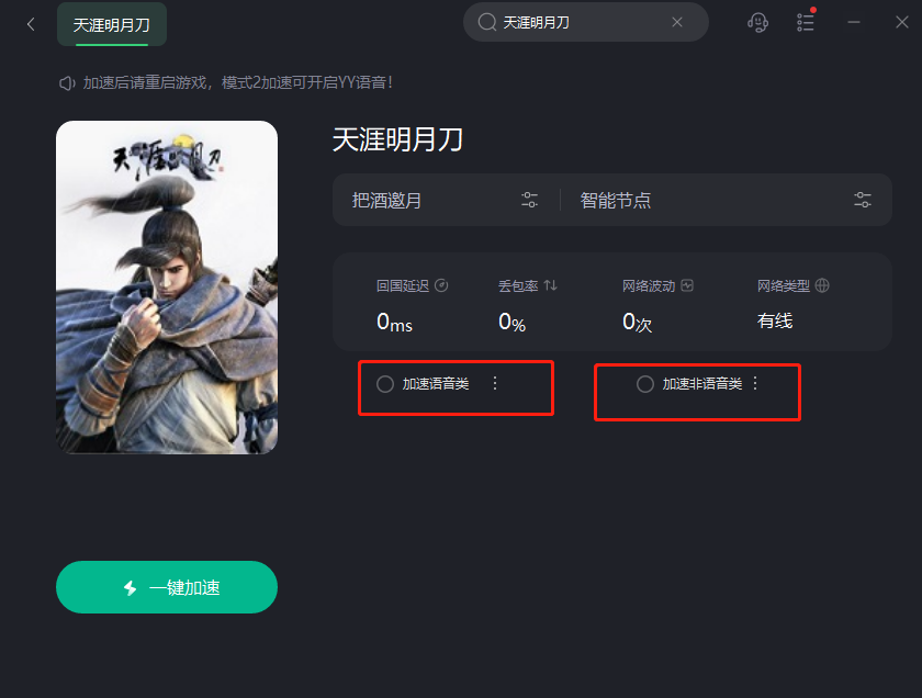 这里我们点击把酒邀月,并加速,就能以超低延迟进入游戏,而在加速前选择加速非语音类选项,还可以边玩边使用国内的音乐软件哦: