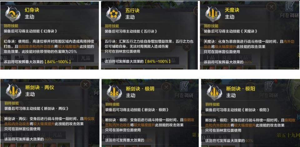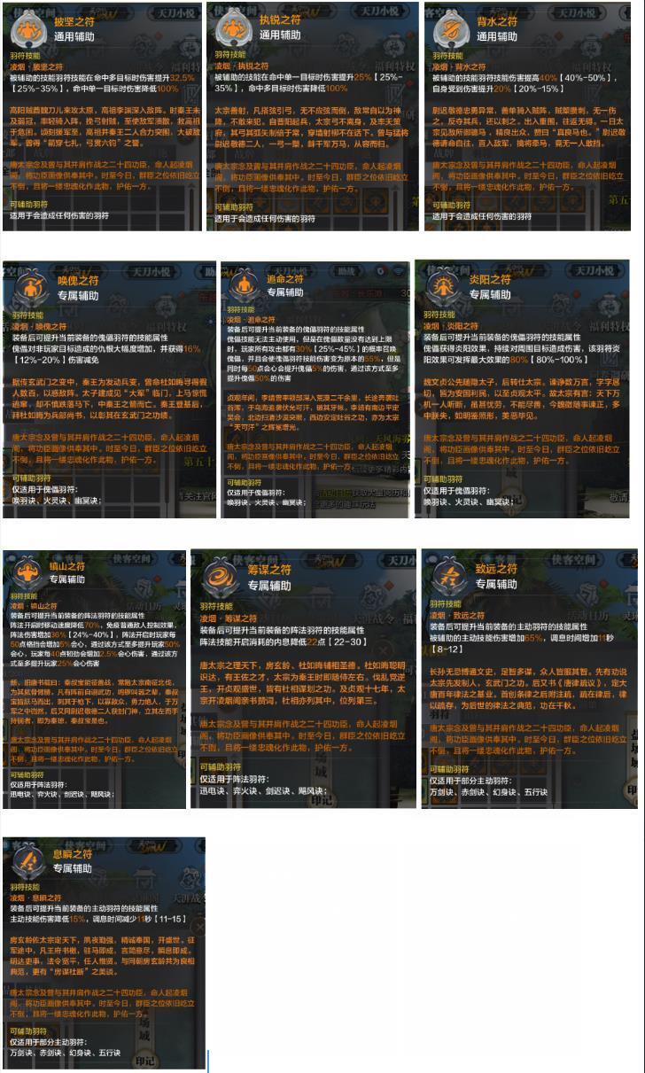 (7)久战之符:装备后可提升当前装备的主动羽符的变身时长和技能伤害,仅对魁影诀、天魔诀、断剑诀·两仪、断剑诀·极阴和断剑诀·极阳生效。