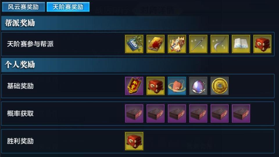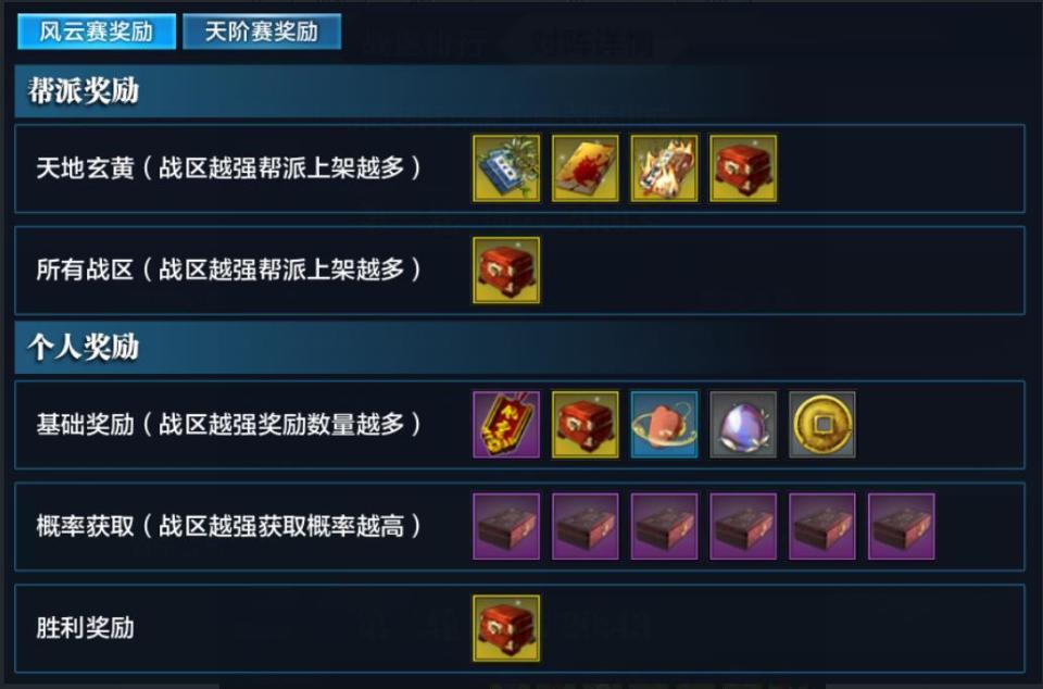 (1)天阶赛参与资格:风云赛结束后,正式服每个大区的前6名获得跨区天阶赛参赛资格(战区升降级完成之后),未获取天阶赛参赛资格的帮派则继续按照风云赛的赛制进行跨服风云赛,但是天阶赛举办期间这些帮派将无法升入天阶战区,其余战区的升降级保持不变。鉴于天下无双大区开放较晚,所以本赛季天下无双大区将一直维持跨服风云赛赛制,不参与跨区天阶赛的争夺。