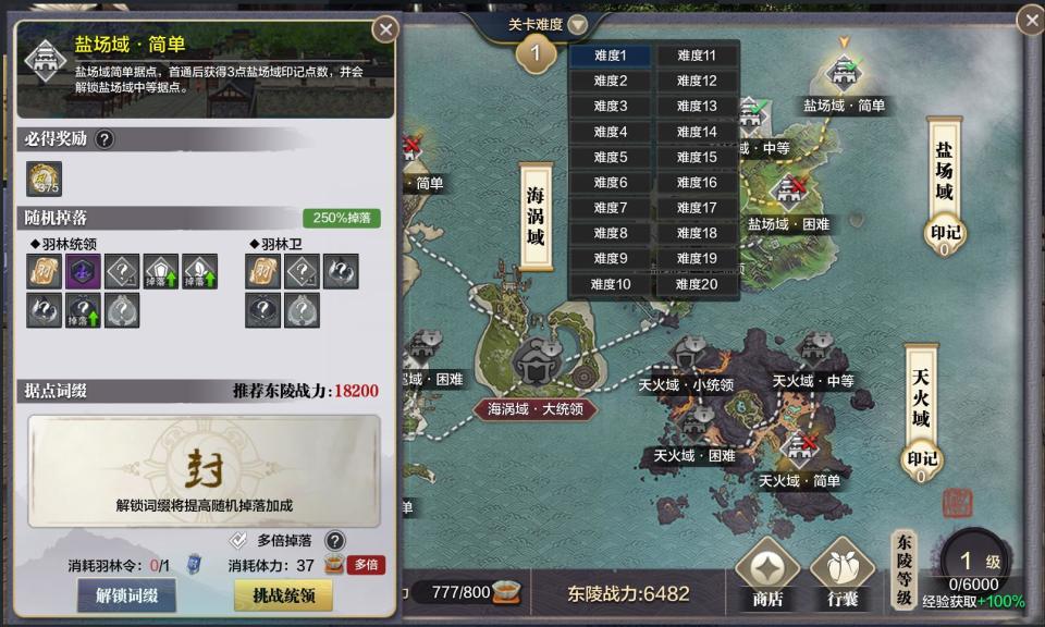 1、少侠可以任意选择已通关的关卡难度进行探索。