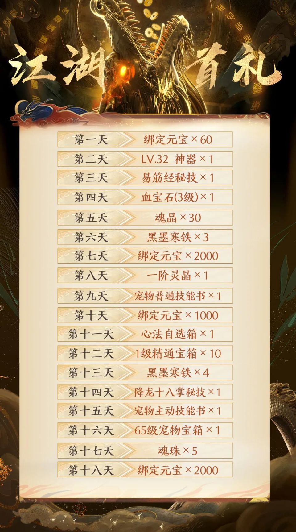 每日登陆都可以在游戏内的江湖首礼中领取丰厚奖励。