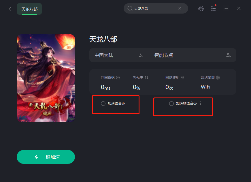 这里我们选择相应区服节点,就能以超低延迟进入游戏,而在加速前选择加速非语音类选项,还可以边玩边使用国内的音乐软件哦: