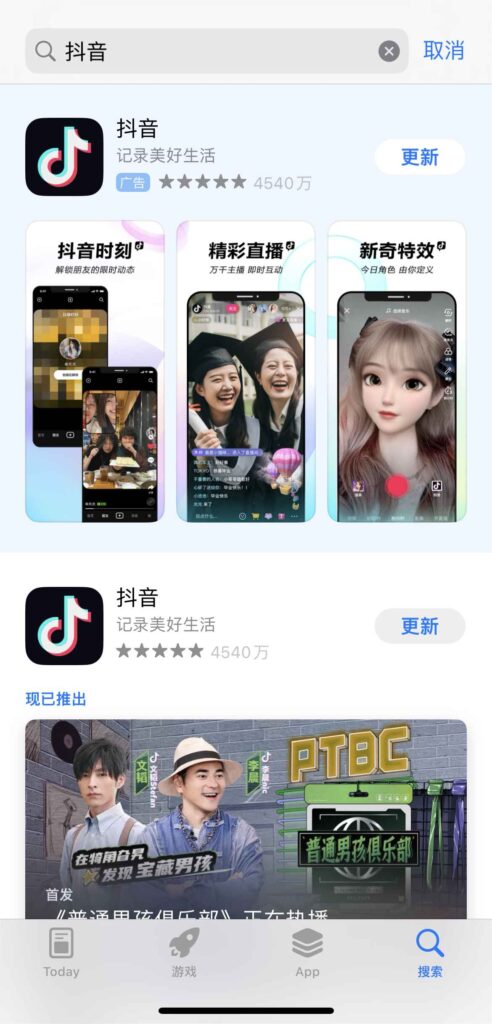加速后,iphone下载中国版抖音,需要先登录中国大陆版的App Store,将地区改为中国大陆下载