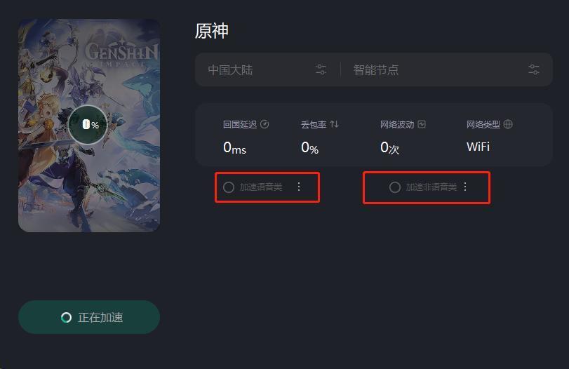 这里我们点击原神,并加速,就能以超低延迟进入游戏,而在加速前选择加速非语音类选项,还可以边玩边使用国内的音乐软件哦: