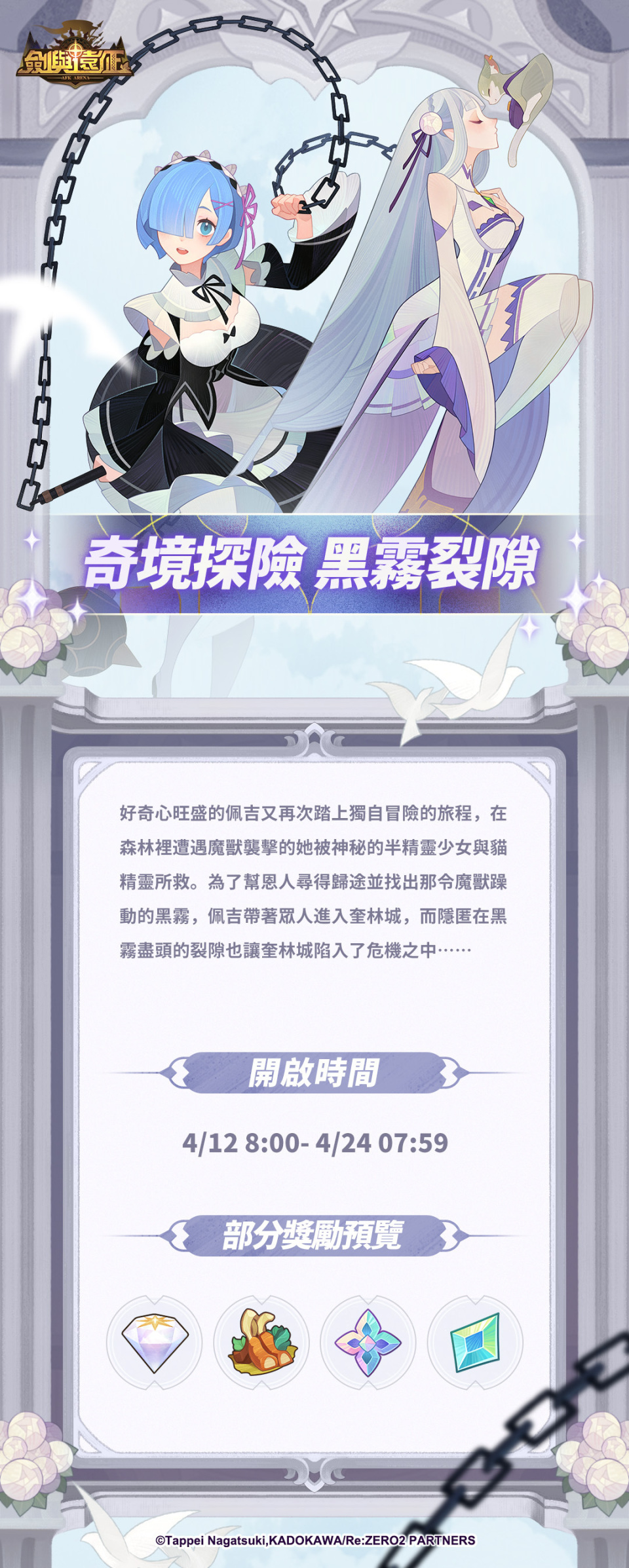 卡牌放置手游《剑与远征》与日本人气动画《Re:从零开始的异世界生活》首次展开联动合作,期间只要完成指定任务就有机会获得「精灵术师- 爱蜜莉雅」以及「鬼族少女- 雷姆」。除此之外,还有趣味冒险「奇境探险黑雾裂隙」。