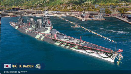 另一方面,吴市港船坞将于12.3版本更新重返游戏,日本主力舰IX 阶Daisen 的建造工程也将正式展开。造船工程由34 个阶段组成,其中29 个阶段可透过达成战斗任务组来完成。IX Daisen在4座炮塔中装备有8门410 毫米主炮和4座4联装鱼雷发射器,其长程鱼雷可造成显著伤害。完成建造工程的奖励则包括主力舰IX Daisen,附带「战争涂料」迷彩、带有10 个技能点数的指挥官、港口船位,以及纪念旗帜。