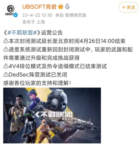 官方消息育碧免费 FPS 游戏《不羁联盟》封测玩家数已经突破 100 万,本来将于北京时间4月24日结束B测,延期至4月26日。