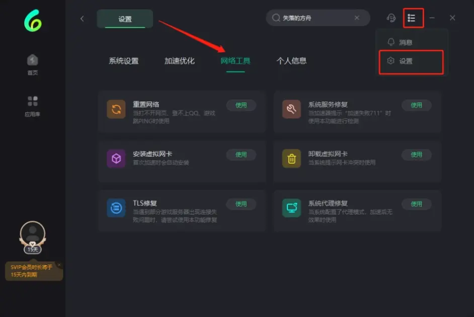 5.使用sixfast的修复工具,找到右上角的序号列表,点击设置,打开【网络工具】,即可修复游戏中碰到的大部分问题了