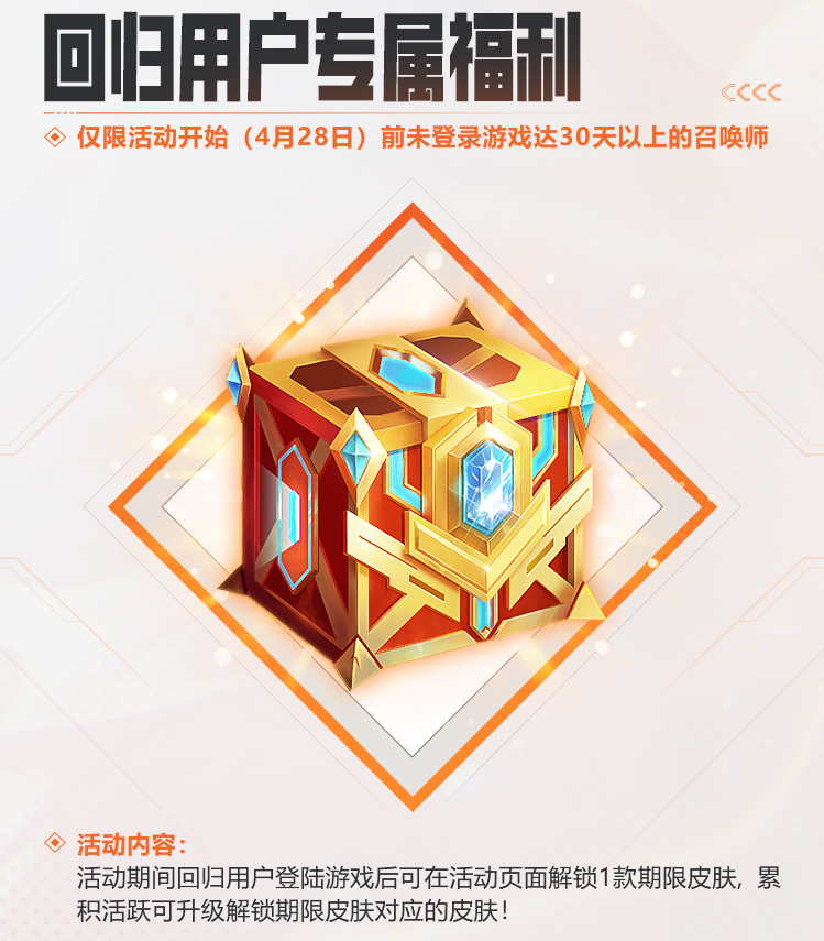 (1)回归召唤师为“截至活动开启时(4月28日)30天(包含)以上未登录游戏”的召唤师;