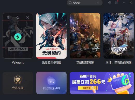 第二步:打开客户端后右上角搜索无畏契约,可以发现不仅支持国服,还支持国际服和许多热门游戏;