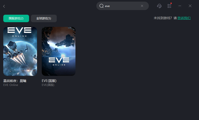 第二步:打开客户端后右上角搜索eve,可以发现不仅支持国服,还支持许多热门游戏;
