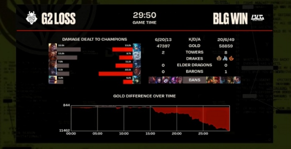 【29:06】小龙刷新,G2不得不接!Bin格温立场先手出击配合Yagao丽桑卓开团,Caps奎桑提进场强切死了Elk卢锡安!但是此时自己后排也被BLG切碎了!Bin格温扛着Broken Blade杰斯伤害将他反杀,拿下三杀!BLG打出2换5团灭G2!直接一波结束比赛,淘汰欧洲最后的希望G2!
