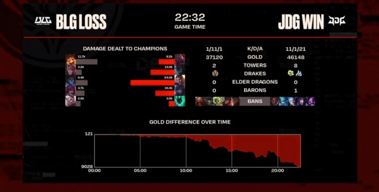 【21:57】JDG抱团推掉下二塔,Xun蔚在JDG双C的伤害面前脆得像张纸直接被秒!正面没人能抗的住knight杰斯的伤害!JDG不管了直接推塔,一波结束比赛!3比1击败BLG,拿下队史上的首座MSI冠军