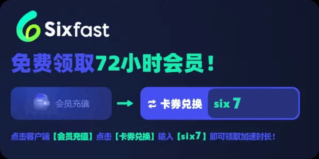 现在在手机端用户可以在  Sixfast   【我的】中点击【立即续费】兑换码内填【six7】领取免费时长,桌面端的用户在   Sixfast    左侧【会员充值】找到【卡券兑换】填【six7】也能领取 !