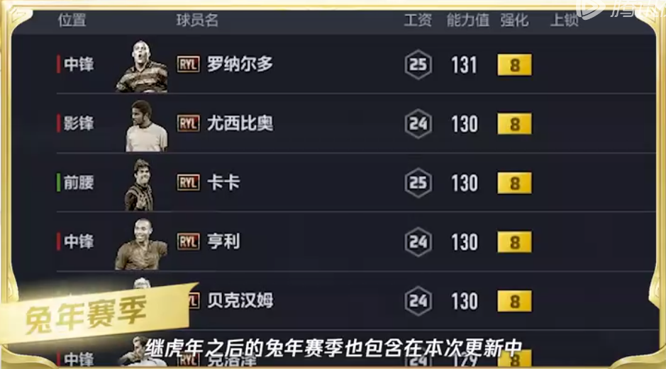 专属于国服的特色限定生肖赛季——兔年赛季,即将在周年庆版本登场。罗纳尔多、贝利等13位巨星,他们或是兔年出生,或是如兔般矫捷,是继虎年赛季后,第二个生肖限定卡种。随着兔年限定赛季的推出,同时而来的还有专属战衣和队徽,这个周年庆,让我们“兔”飞猛进、大展宏“兔”。