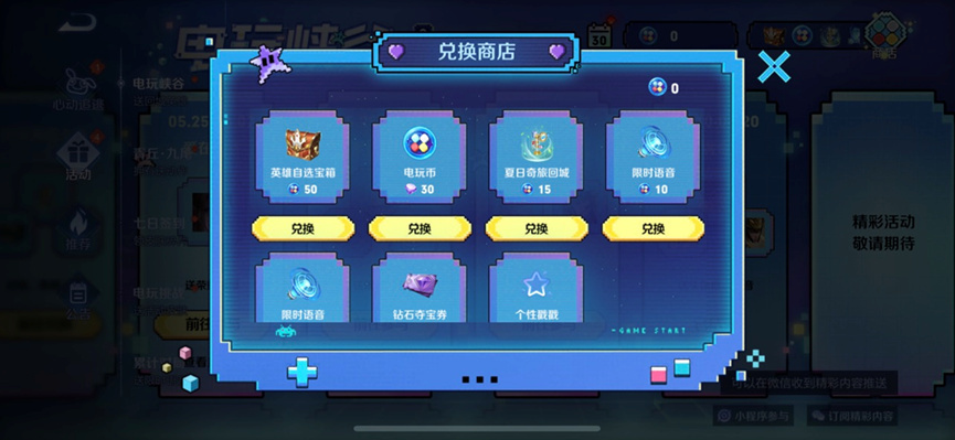 【电玩峡谷】活动商店上架了一批新道具,其中就有永久英雄自选宝箱和夏日奇旅回城特效,玩家通过游戏内的其他活动(比如:极速酷玩)获得电玩币,然后使用电玩币兑换下图这些永久奖励。