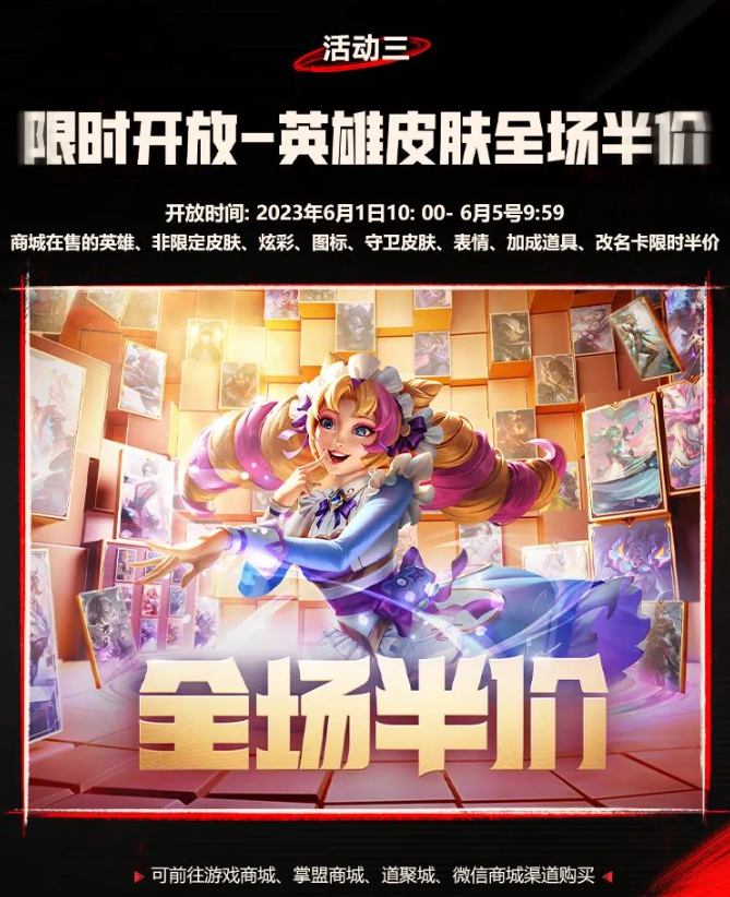 商城在售的英雄、非限定皮肤、炫彩、图标、守卫皮肤、表情、加成道具、改名卡限时半价