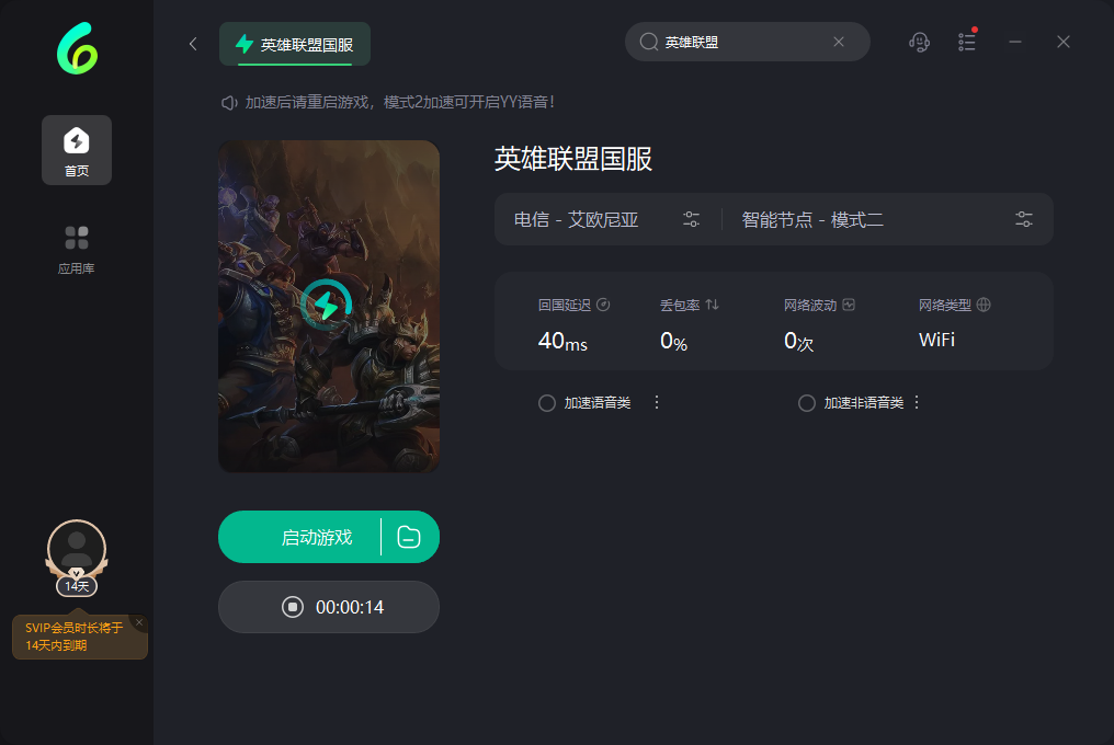 海外的玩家玩国服是需要网速加持的,如果遇到卡顿、延迟问题,会让游戏的体验不好,国外的玩家这个时候就需要用到sixfast来解决了,搜索找到sixfast下载好后就可以开始加速了,如图搜索找到英雄联盟,启动游戏后就能解决云顶之弈弈子技能延迟、卡顿等问题了,这里没有加速时长的玩家在Sixfast左侧【会员充值】找到【卡券兑换】填【six4】或者在Sixfast官 网登录后,在【个人中心】【兑换码】处填【six4】就能领取免费时长了哦!