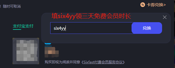 这里没有加速时长的玩家在Sixfast 左侧【会员充值】找到【卡券兑换】填【six4yy】,手机端用户可以在 Sixfast 【我的】中点击【立即续费】兑换码内填【six4yy】,或直接在Sixfast 官 网 注 册 登 录 后,在【个人中心】【兑换码】处填【six4yy】就能领取免费加速时长了