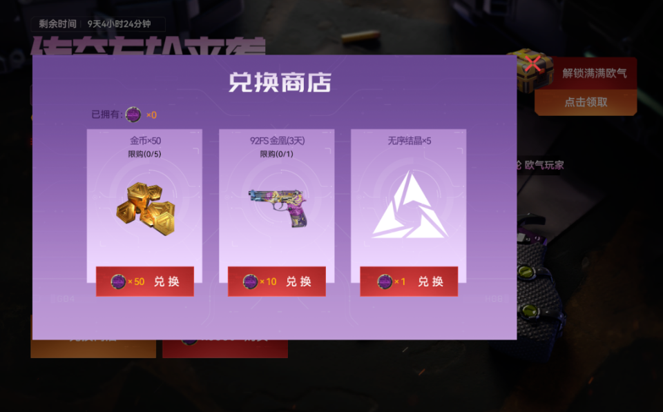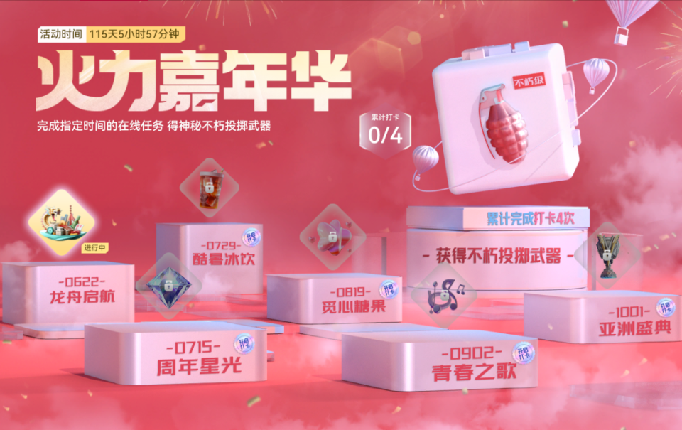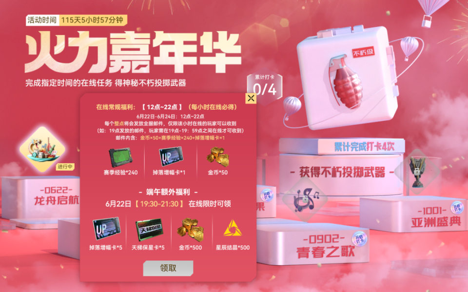 2、累计完成4次打卡(登录并参与在线活动领取在线奖励)即可领取全新不朽级投掷武器。