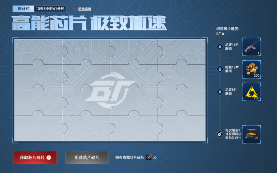 2、每安装一个高能芯片碎片可获得一个随机奖励,16个高能芯片碎片可将高能芯片组装完成。