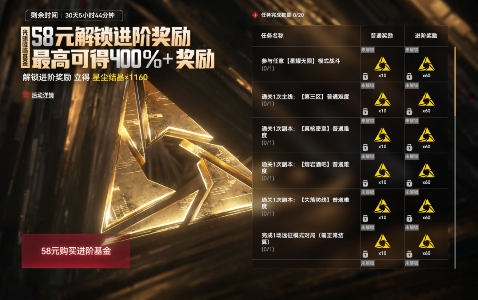 2、58元解锁进阶奖励 立得星尘结晶x1160 ,完成任务最高可得4倍奖励。