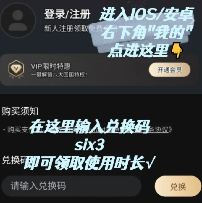 如果提示已过期或时长不够,则可以参照下图方法,在Sixfast客户端输入兑换码six3获取使用时长: